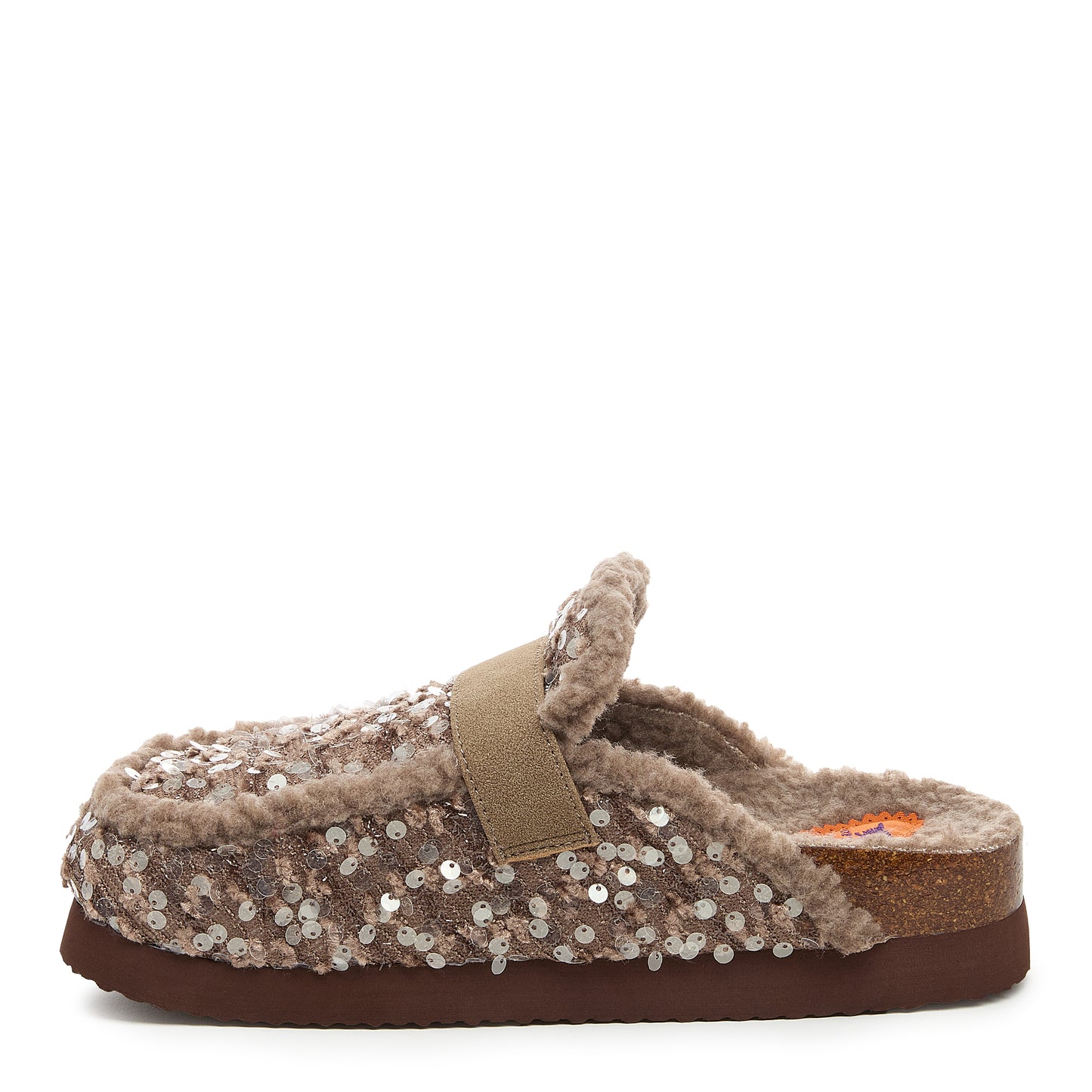 The Artic Brown Sequin Mule takes cozy comfort and gives it a touch of glam. With a woven sequin-covered upper, soft faux shearling lining, and a cushy EVA flatform, this slip-on is perfect for adding sparkle to your at-home looks or low-key errands. It’s the kind of shoe you’ll reach for when you want that blend of lounge and luxe.